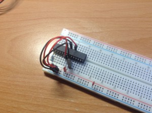If you’d only use these components, the ATMega would run using its inbuilt 8MHz crystal. We can double its speed by adding a 16MHz crystal.