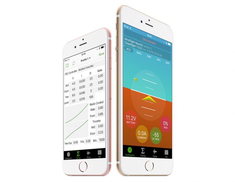 Tune your Cleanflight flight controller with ease from your iPhone or iPad. Just hook up a bluetooth module to your radio controlled aircraft, and you’re ready to go!
