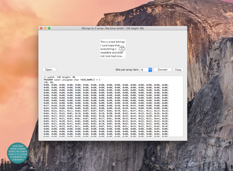 It converts .bmp images to C arrays you can use for, for example the TVout libary and LCD’s. Similar tools are already available for Windows, but not for Mac. So I wrote one myself.
